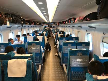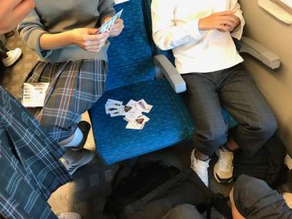 車内風景。おしゃべりやトランプをして、くつろいでいます。中には参考書を広げ、勉強している人も。