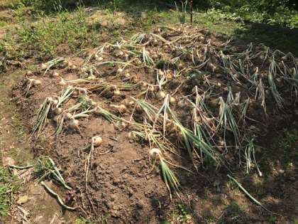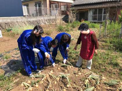 体験1 どの家庭でも、子ども達はよく食べよく寝て、元気イッパイ。1軒目は田口さん宅。2組の女子。タマネギの収穫をしてます。