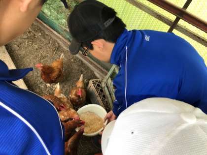 ニワトリの餌やり。とれたての卵でできたプリンです。