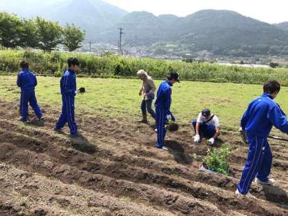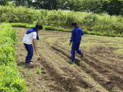 立川さん宅。5組女子。畑を耕し、きゅうりとなすを植え付けています。