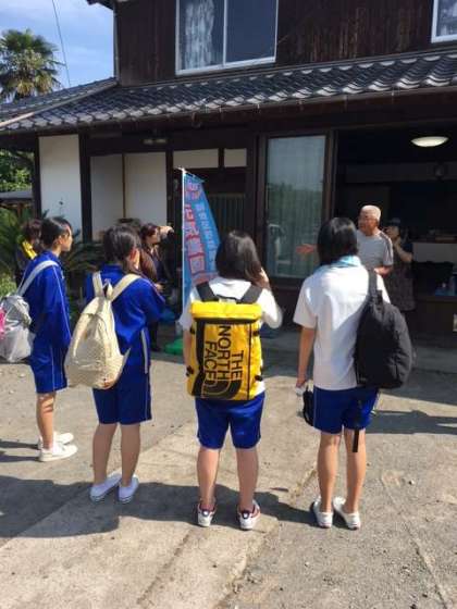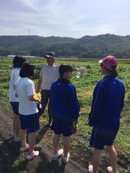 体験13 末松さん宅。3組女子。とれたてのグリンピースを味見しました。その後、ジャガイモの収穫です。