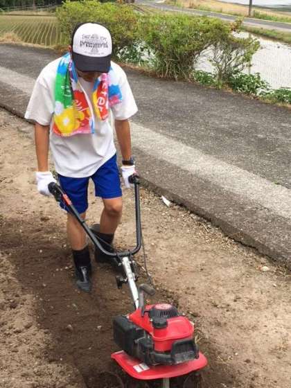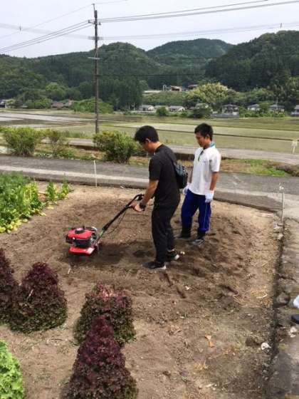 体験16 朝倉さん宅。2組男子。耕運機で畑を耕しています。