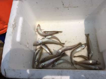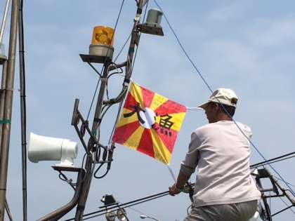 1組男子は今朝の漁で天然記念物のカブトガニを取りました。船の上で獲りたてのイカも食べました。