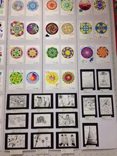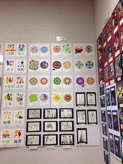 2年生22名の「幾何学模様のデザイン」と3年生14名「点描画」作品です。