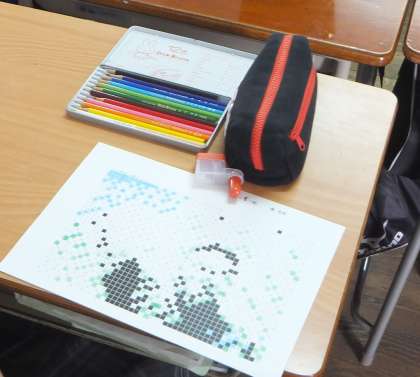 3.A4サイズ 47×32 1504マス(1マス5mm×5mm) のシートを、みんなで色鉛筆を使って決められた色で光沢がでるまで塗りつぶす(生徒一人につき2枚)