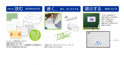 様々な教科のワークシートをはさめる。マーカーで書き消しができる。黒板に貼れる。「書き込む」ことによって、子どもたちが意見を出し合い、考えを深める授業を行う事ができます。