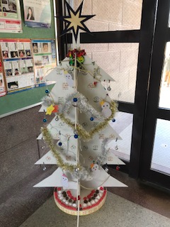 もうすぐクリスマス。玄関ホールに、管理作業員さん手作りのクリスマスツリーが飾られました。