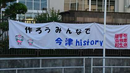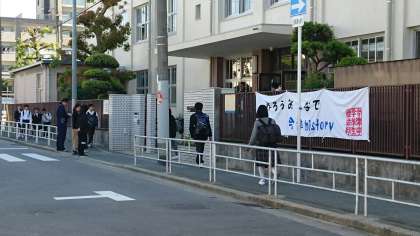 登校時、正門付近に掲げ生徒会役員であいさつ運動を行って