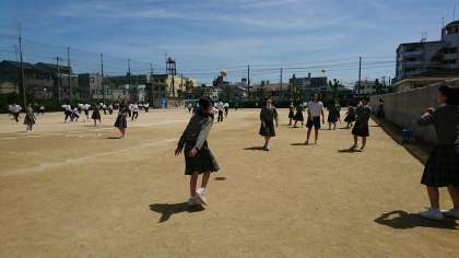 たくさんの生徒が昼休みにグラウンドで遊んでいます。