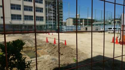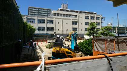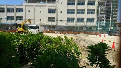 給食棟の工事も順調に進んでおり、工事関係者の方々も細心の