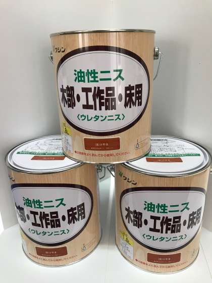 日々の使用により傷みが生じた机天板を夏休み期間を利用して、教職員で毎年補修しています。その補修材料となる「ウレタンニス」・「うすめ液」・「木工パテ」・「刷毛」・「耐水ペーパー」を購入しました。