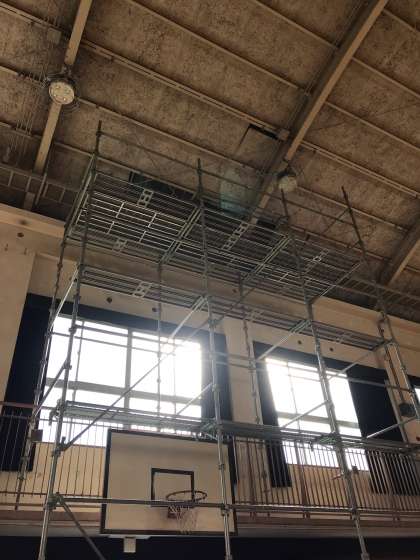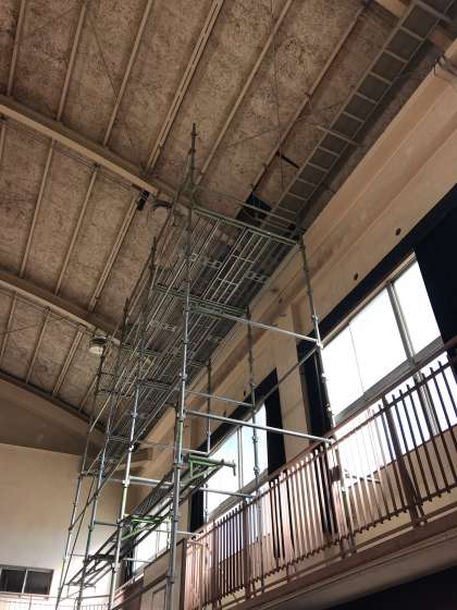 体育館内に足場を組んでの補修となり、授業やクラブ活動