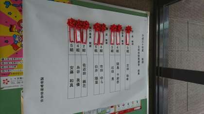 上:後期生徒会選挙結果(紅白のリボンで飾りました)