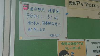正門から入って1階の廊下、掲示板にはみんなに大切なお知らせや