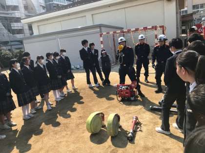 全体で集合し、地域の防災リーダーの方のお話を聞いた後、1年生は防災授業、2年生は消防訓練を行いました。