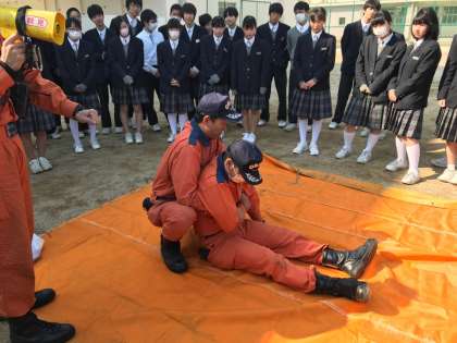 防災訓練では、可搬式ポンプ、消化器体験、けが人搬送体験の3か所に別れ、消防隊員の方にやり方を教えてもらいながら、体験をしました。