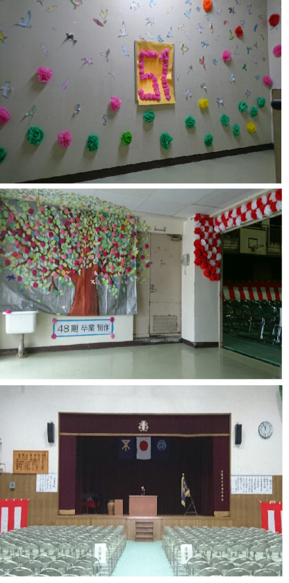 生徒が登校し、明日に行われる第51回入学式の準備が行われ