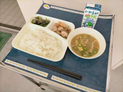今日の献立は、「ご飯、鶏肉のてり焼き、とうがんのみそ汁、なすのそぼろいため、牛乳」でした。