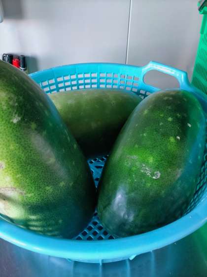右側の写真は、とうがんのみそ汁に使用したとうがんです。30cm以上ある立派なとうがんが届きました✨