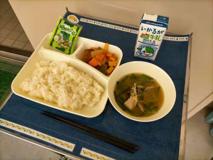 今日の献立は、「ご飯、酢豚、中華みそスープ、まっ茶大豆、牛乳」でした。