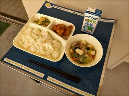 今日の献立は、「ご飯、ヤンニョムチキン、とうふのスープ、切り干し大根のナムル、牛乳」でした。
