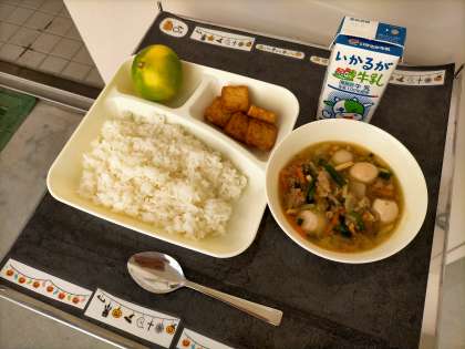 今日の献立は、「中華丼、あつあげの中華だれかけ、みかん、牛乳」でした。