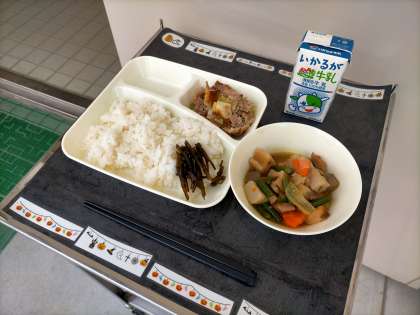 今日の献立は、「ご飯、豚肉の梅風味焼き、ふきよせ煮、くきわかめのつくだ煮、牛乳」でした。