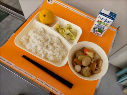 今日の献立は、「ご飯、関東煮、白菜の甘酢あえ、みかん🍊、牛乳」でした。