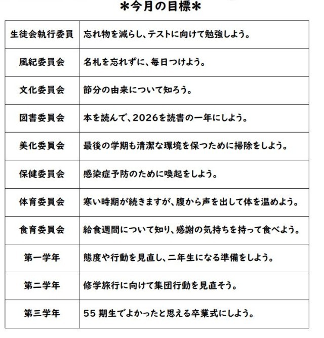 2月2日(月)全校集会で、生徒会、各学年、各委員会の代表からの「今月の目標(2月)」の発表がありました。