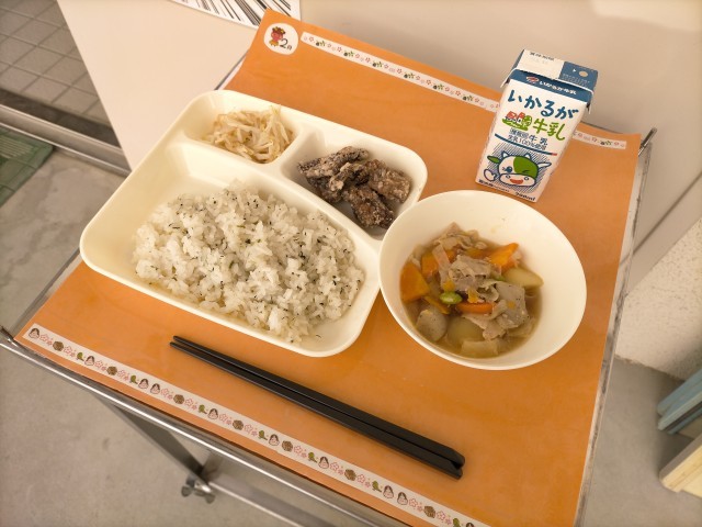 今日の献立は、「菜飯、くじらのたつたあげ、豚肉とじゃがいもの煮もの、もやしの甘酢あえ、牛乳」でした。