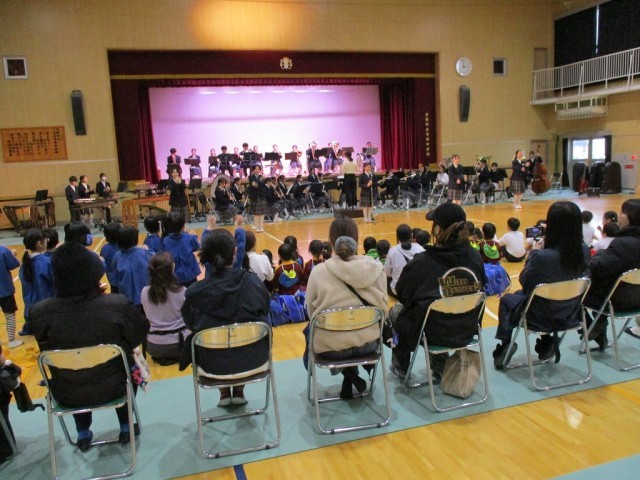 2月27日(金)14:50~、近隣の保育園・幼稚園との交流として、幼児、園児、保護者、教職員をお招きし、今津中学校吹奏楽部の演奏会を実施しました。