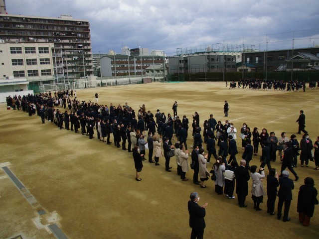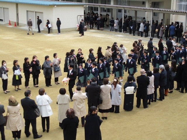 第55回卒業式が閉会し、花道の中、卒業生がたくさんの保護者に祝福の拍手で見送られました。