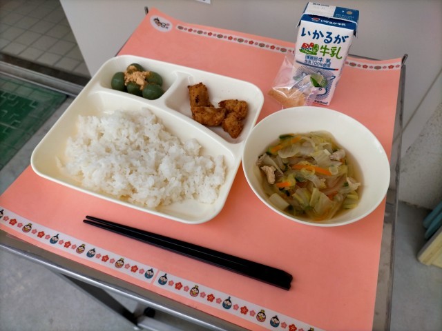 今日の献立は、「ご飯、豚肉のたつたあげ、五目汁、よもぎだんご(きな粉)、牛乳」でした。