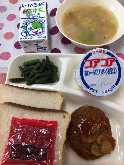煮込みハンバーグ、コーンスープ、さんどまめのサラダ、ヨーグルト、食パン、いちごジャム、牛乳です。