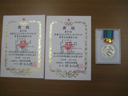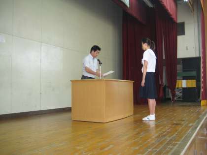 9月8日(月)の全校集会において、校長先生の講話の後、東京で行われた第37回全国JOCジュニアオリンピックカップ夏季水泳競技大会に出場した3年生の長澤未波さんの表彰を行いました。