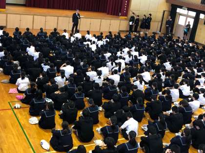 本日は、いいお天気に恵まれた朝を迎えました。令和最初の全校集会を行っています。