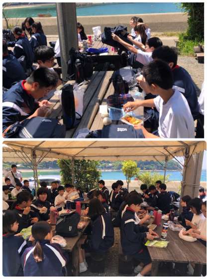 日高の美しい海を背にして、班ごとに昼食をとっています。