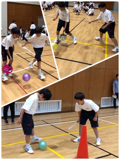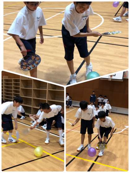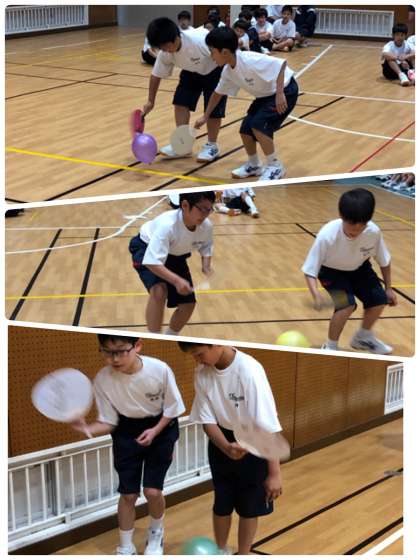 室内レクレーション大会がはじまりました。まずは、風船うちわリレーです。