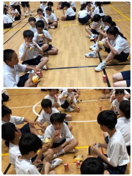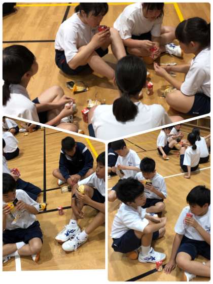 いっぱい運動してお腹を満たすために、メロンパンとジュースの補食をしています。