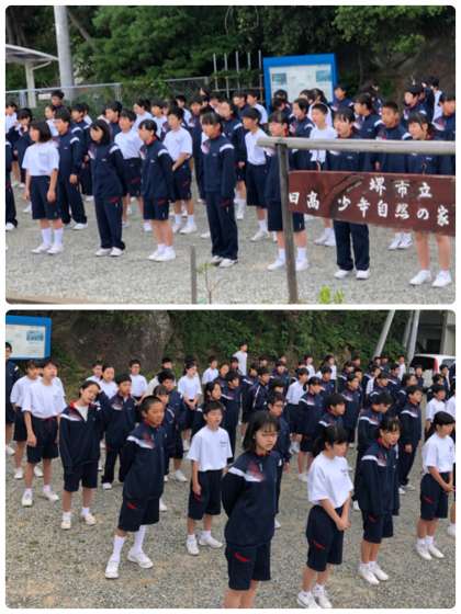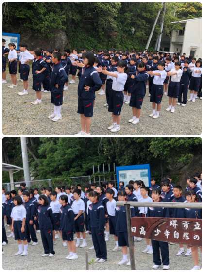 朝のあいさつをして、校歌を歌っています。