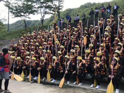 安全で楽しくラフティングを行うために、全体でセーフティートークの指導を受けています。
