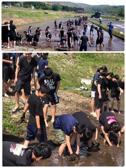 泥の感触が気持ちよさそうて、歓声が上がっています。