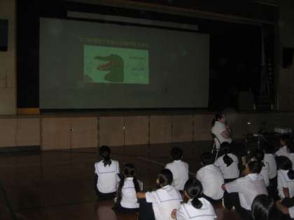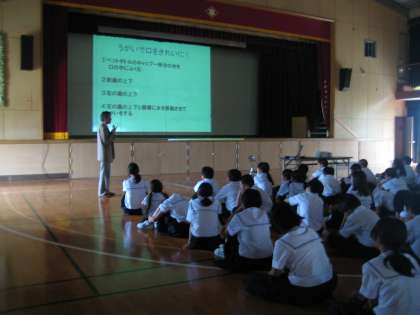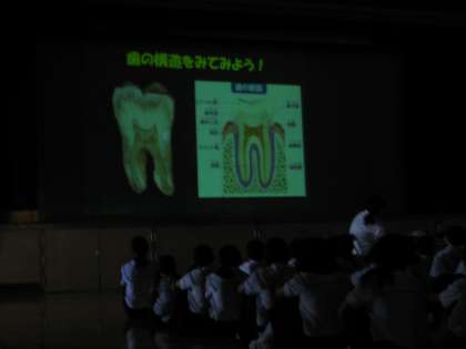 始めに、保健室の前川先生から、歯の構造と役割、むし歯と歯肉炎、噛むことの重要性についてパワーポイントを使って説明し、その後、学校歯科医の松井先生から、口内を清潔にするうがいの方法や歯みがきの仕方について教えていただきました。