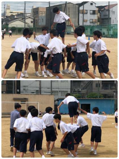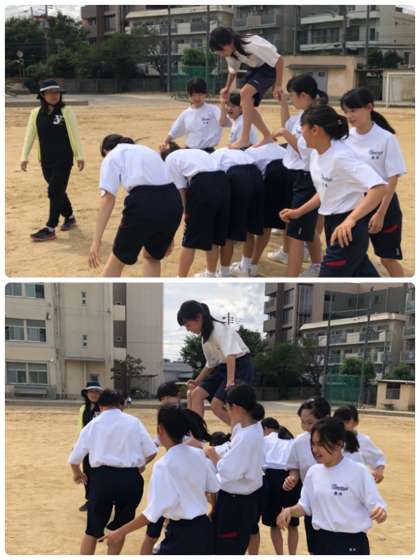 学年種目「せんどうさん」は、男女別で背中で人を受け渡していく競技です。