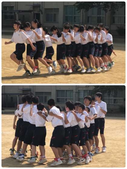 肩を組んで笑顔いっぱいに進んでいったり、数珠つなぎで転んでいったり、クラスごとに盛りあがっています。