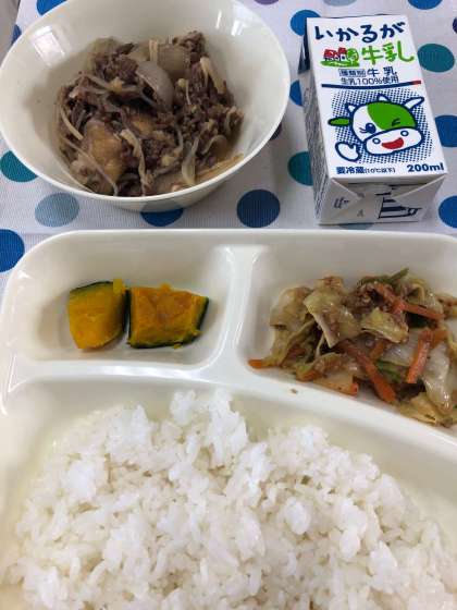 すき焼き煮、焼きかぼちゃ、野菜のそぼろいため、ごはん、牛乳です。