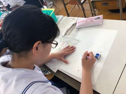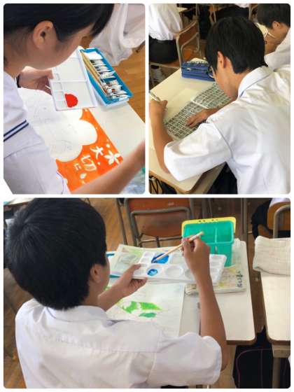 2年生の美術の授業では、自分でデザインしたポスターを描いています。