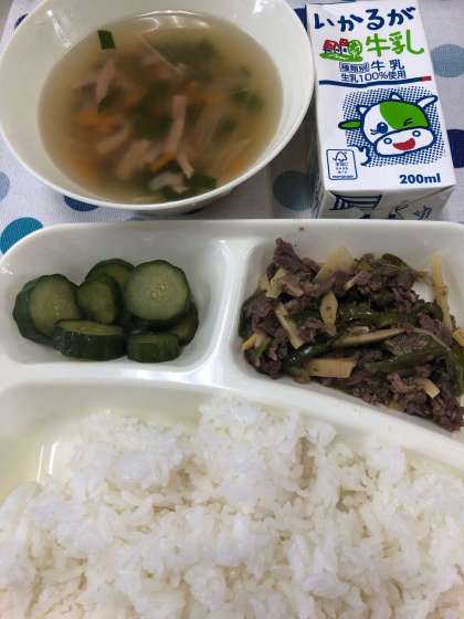 チンジャオニューロウスー、ハムと野菜の中華スープ、きゅうりの辛み漬け、ごはん、牛乳です。