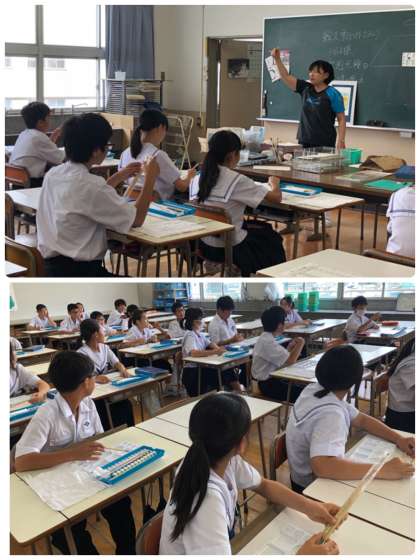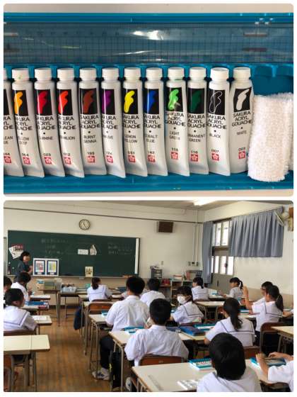 1年生の美術の授業では、新しく準備が整った「ポスターカラー」セットの使い方を学習しています。