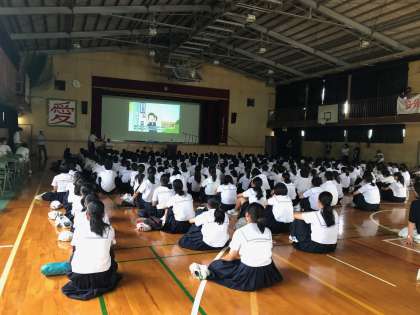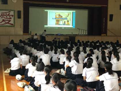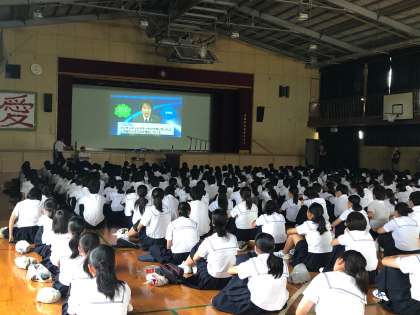 鶴見警察署の方を講師として、情報モラル講演会「スマートフォンの使い方について」を体育館で行っています。